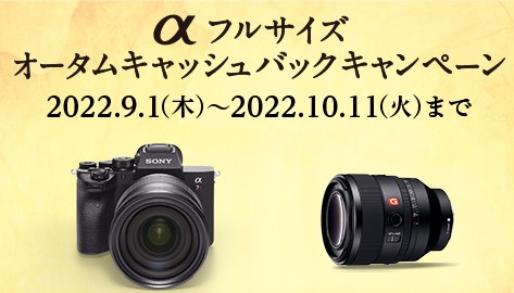 α フルサイズ オータムキャンペーン期間中に対象のカメラ本体またはレンズを購入・応募されたお客様に、最大で50,000円がキャッシュバックされます。さらに対象のカメラ本体とレンズを同時購入なら、さらに追加で10,000円…