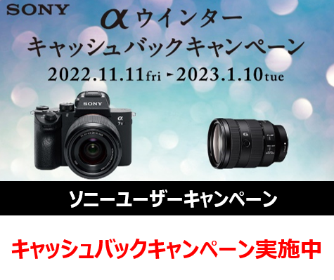 α ウインターキャンペーン期間中に対象のカメラ本体またはレンズを購入・応募されたお客様に、最大で20,000円がキャッシュバックされます。さらに対象のカメラ本体とレンズを同時購入なら、さらに追加で10,000円がキャッシ…